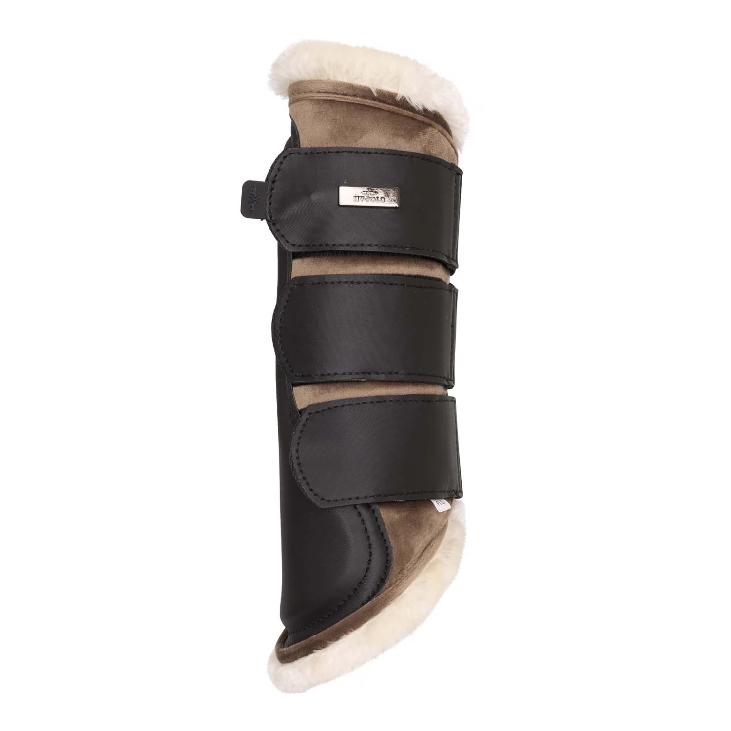 Dressurgamaschen aus luxuriösem Samtmaterial mit einem Futter aus Kunstpelz. Mit kleiner Metallplatte und Gummilabel am oberen Verschlussriemen.